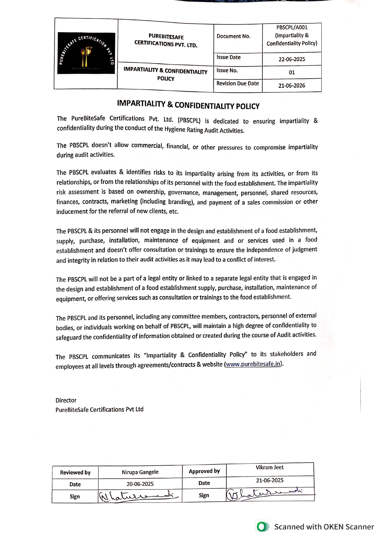 I hereby declare that I have carefully read, understood and accepted the Impartiality & Confidentiality Policy of PureBiteSafe Certifications Pvt. Ltd. and I will adhere to the below-mentioned points which are necessary for the conduct of the effective and impartial audit. I will also strictly maintain the confidentiality of the information gained during the conduct of the audit.